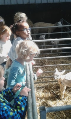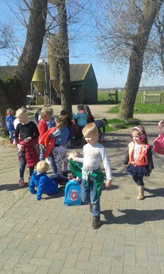 Na bijna een week geoefend te hebben in de boerderij op school mochten we afgelopen dinsdagmiddag naar een echte boerderij op bezoek. Vergezeld door een heerlijk zonnetje vertrokken we met zijn allen naar de boerderij van de familie Onderwater. Aangekomen op het erf werden we verwelkomd door Marielle en haar hond. De schoenen werden verwisseld voor laarzen en we gingen op kraamvisite bij de schapen en de geit. Wat waren ze schattig en lekker zacht die kleine lammetjes, we konden er geen genoeg van krijgen. De jongens kregen de poes in de gaten en ook die werd vertroeteld.