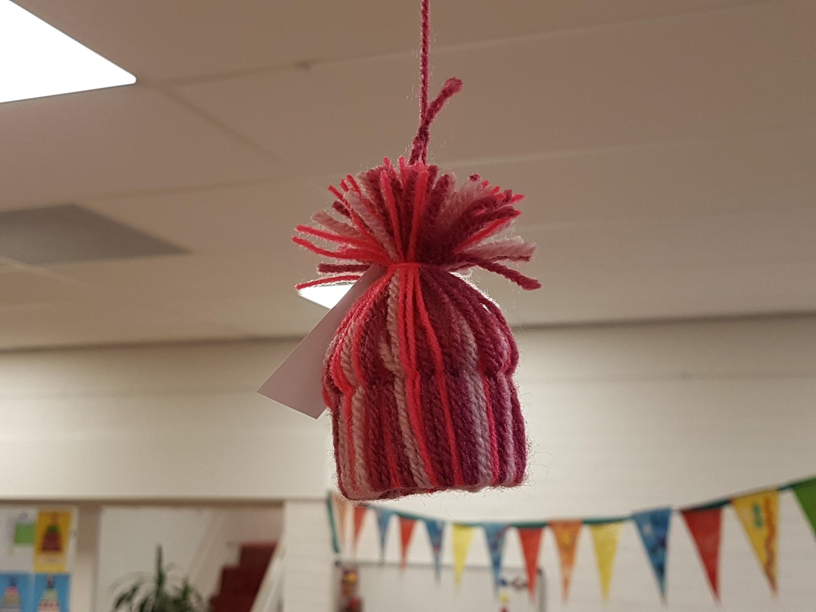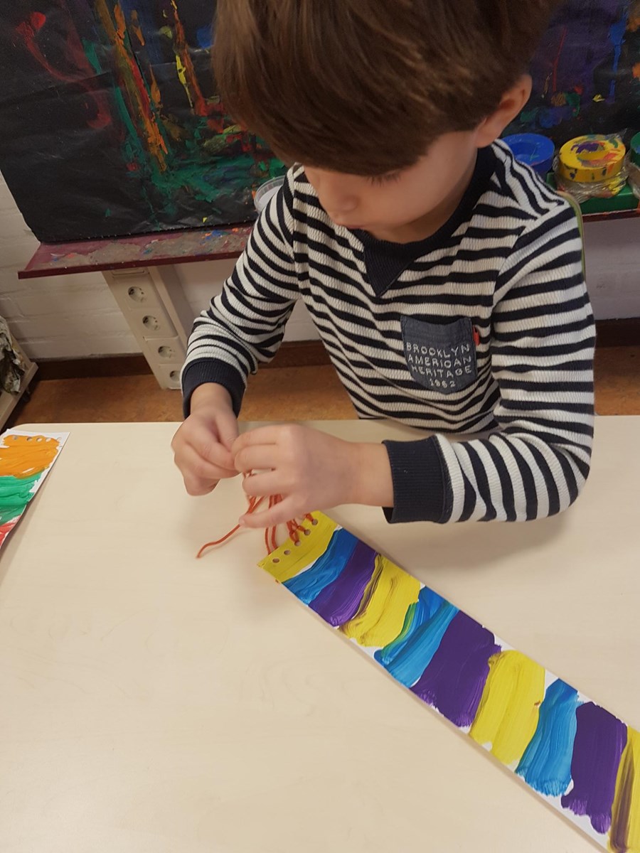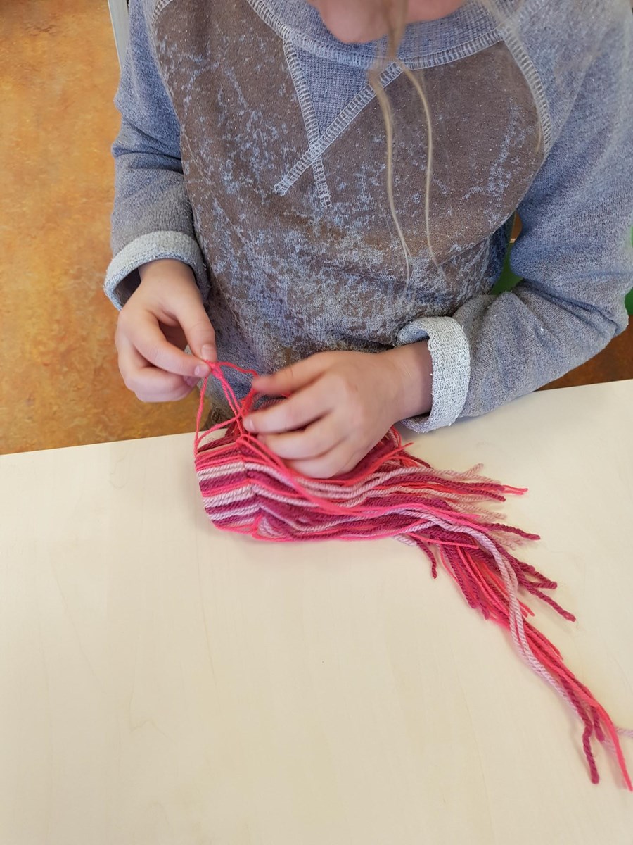 Zo zijn we aan de slag gegaan met het maken van een sjaal, waarbij een patroon met drie kleuren erop wordt geverfd. We oefenen ook onze fijne motoriek door knoopjes te maken aan onze geverfde sjaaltjes. Daarnaast zijn we begonnen met het maken van een muts van wol, ook hiermee oefenen we onze fijne motoriek.