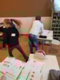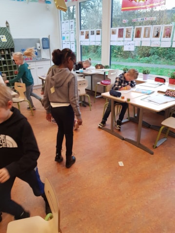 We deden een visueel dictee waarbij ieder kind een post-it met een woord op zijn of haar rug geplakt kreeg. De kinderen moesten door de klas gaan lopen en zoveel mogelijk dicteewoorden, die ze op rug van andere kinderen lazen, op hun eigen blaadje schrijven. Dit was een groot succes!
