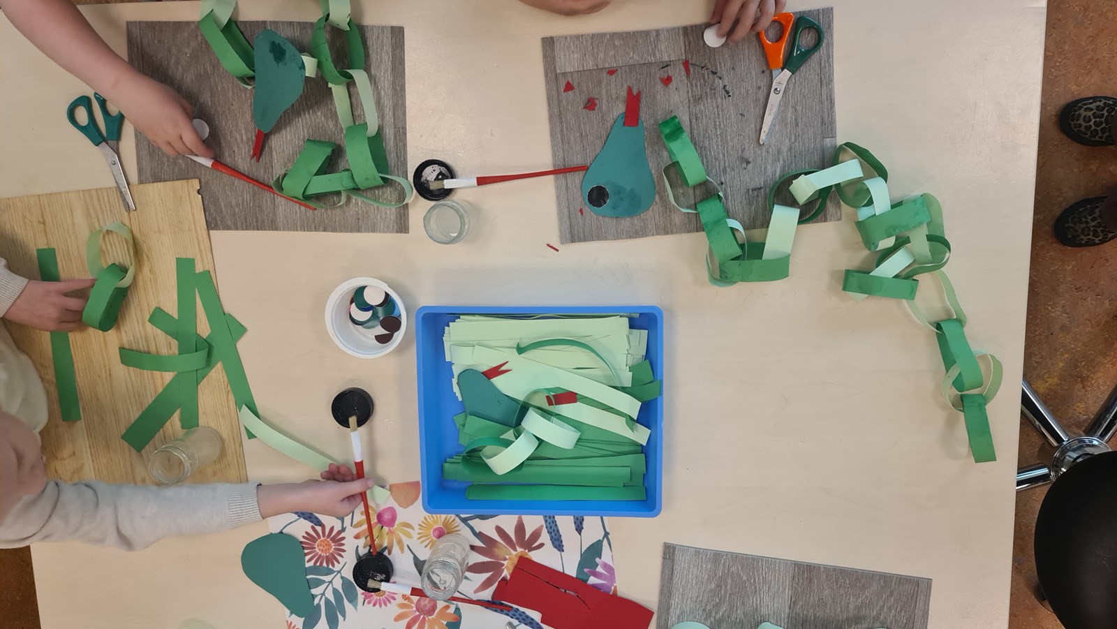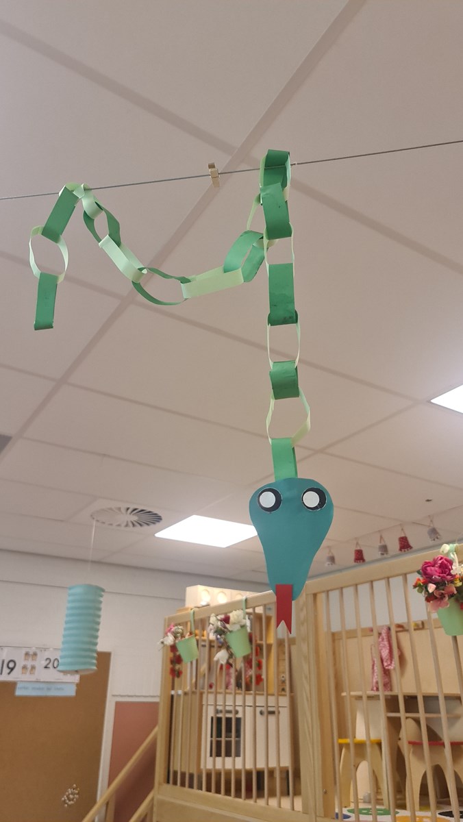 De jongste kinderen hebben een slang gemaakt door rondjes aan elkaar te maken met stroken papier. Ook onze klas komt al steeds meer in junglesferen!