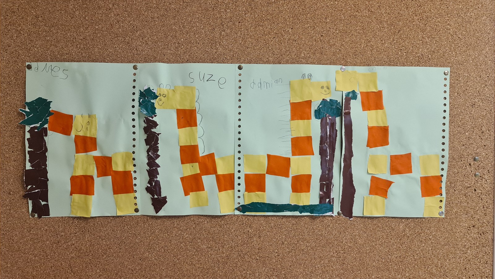 Verder hebben de oudste kinderen een giraf gemaakt van papier. Zij vouwden eerst 16vierkantjes, knipten deze vervolgens los en puzzelden de giraf in elkaar.