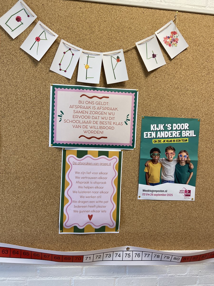 Volgende week is het de week tegen pesten. Zie de poster tussen de foto’s. Ook daarin ziet u onze afspraken van de klas. Deze afspraken hebben de kinderen zelf bedacht met elkaar en hangen op het prikbord.