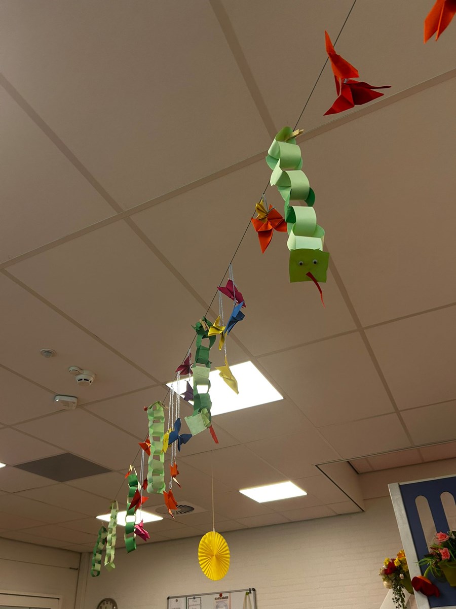 Ook hebben we vlinders gevouwen, deze hangen nu in de klas tussen de slangen. De jongste kleuters hebben een giraffe gemaakt en we zijn begonnne aan de werkjes voor in het portfolio.