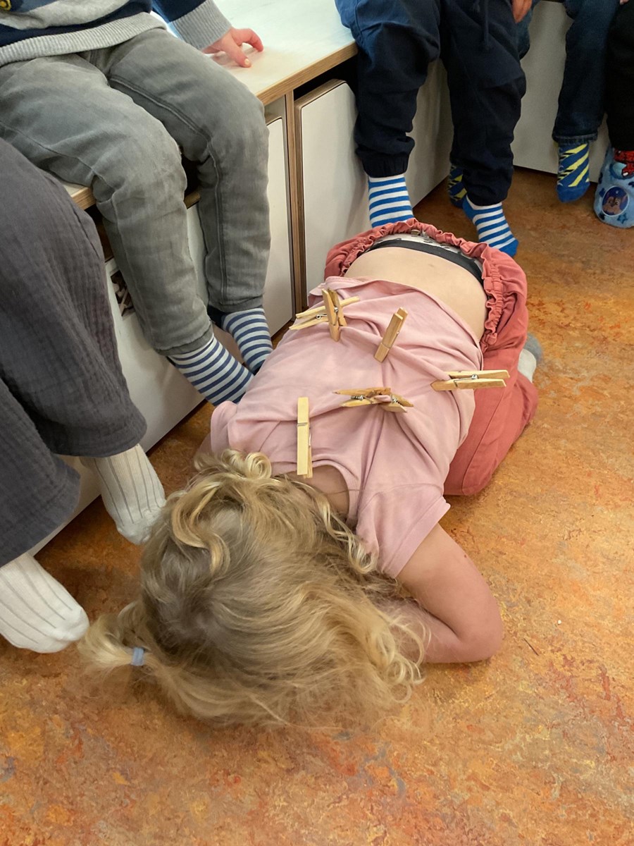 Ook hebben we verschillende activiteiten gedaan waarbij de kinderen geleerd hebben over de egel. We hebben elkaar omgetoverd tot een egel door knijpers op elkaars rug te knijpen. Kinderen die de pincetgreep onder de knie hadden konden de knijper al open krijgen. Voor andere kinderen was dit even oefenen. Het versje dat ging over een egel die zijn stekels was verloren paste perfect bij deze motorische activiteit.
