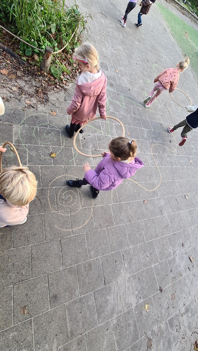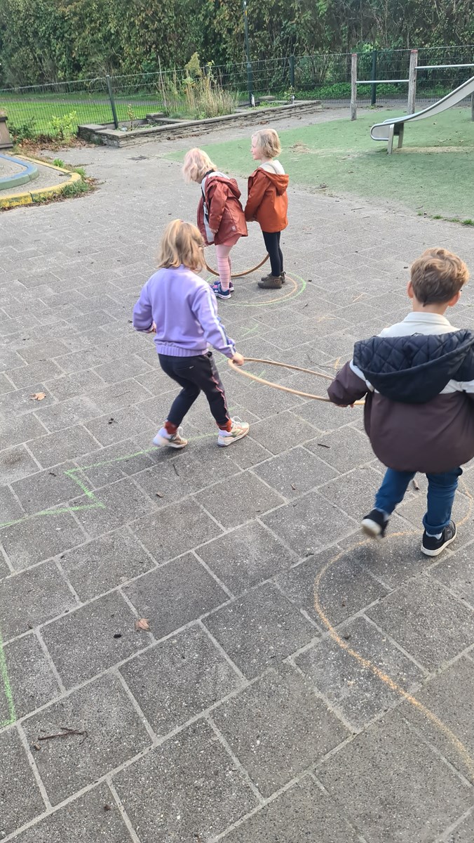 Als afsluiting van het thema deden we een beweegparcours op het schoolplein. De kinderen liepen in tweetallen als jungledieren de uitgezette route, waarbij zij samen een hoepel vasthielden. Ze volgden lijnen, sprongen in de richting van de pijlen en draaiden rond. Dit allemaal zonder de hoepel los te laten.