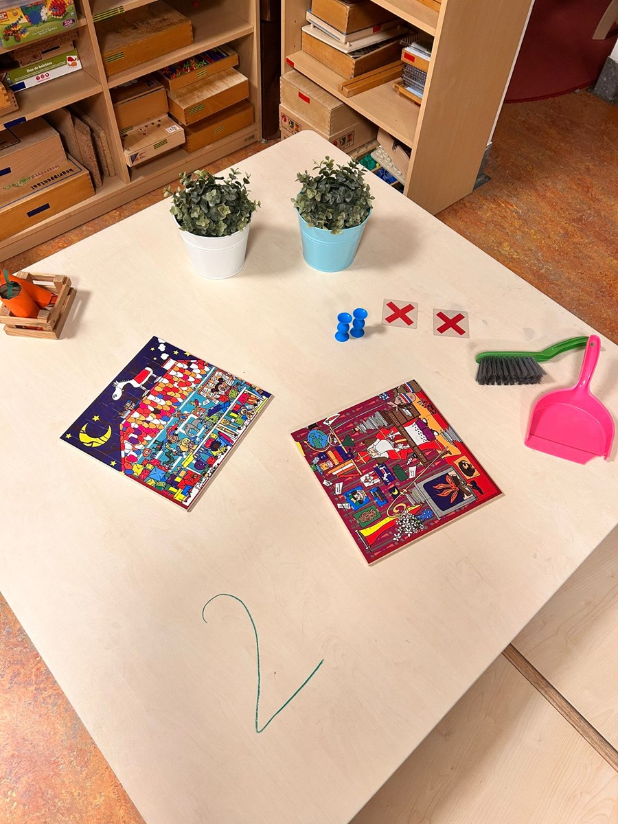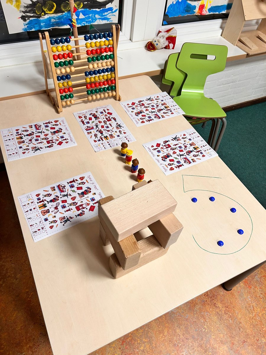 We hebben ook ons schoentje gezet. De volgende ochtend lag er een cadeau van Piet. Het was een telpiet! Op elke tafel had hij een cijfer geschreven en erbij lagen spullen uit de klas in dat aantal. De kinderen gingen meteen tellen.