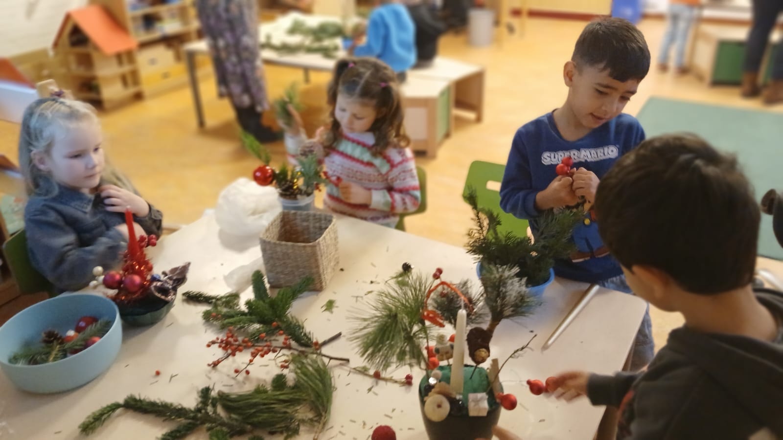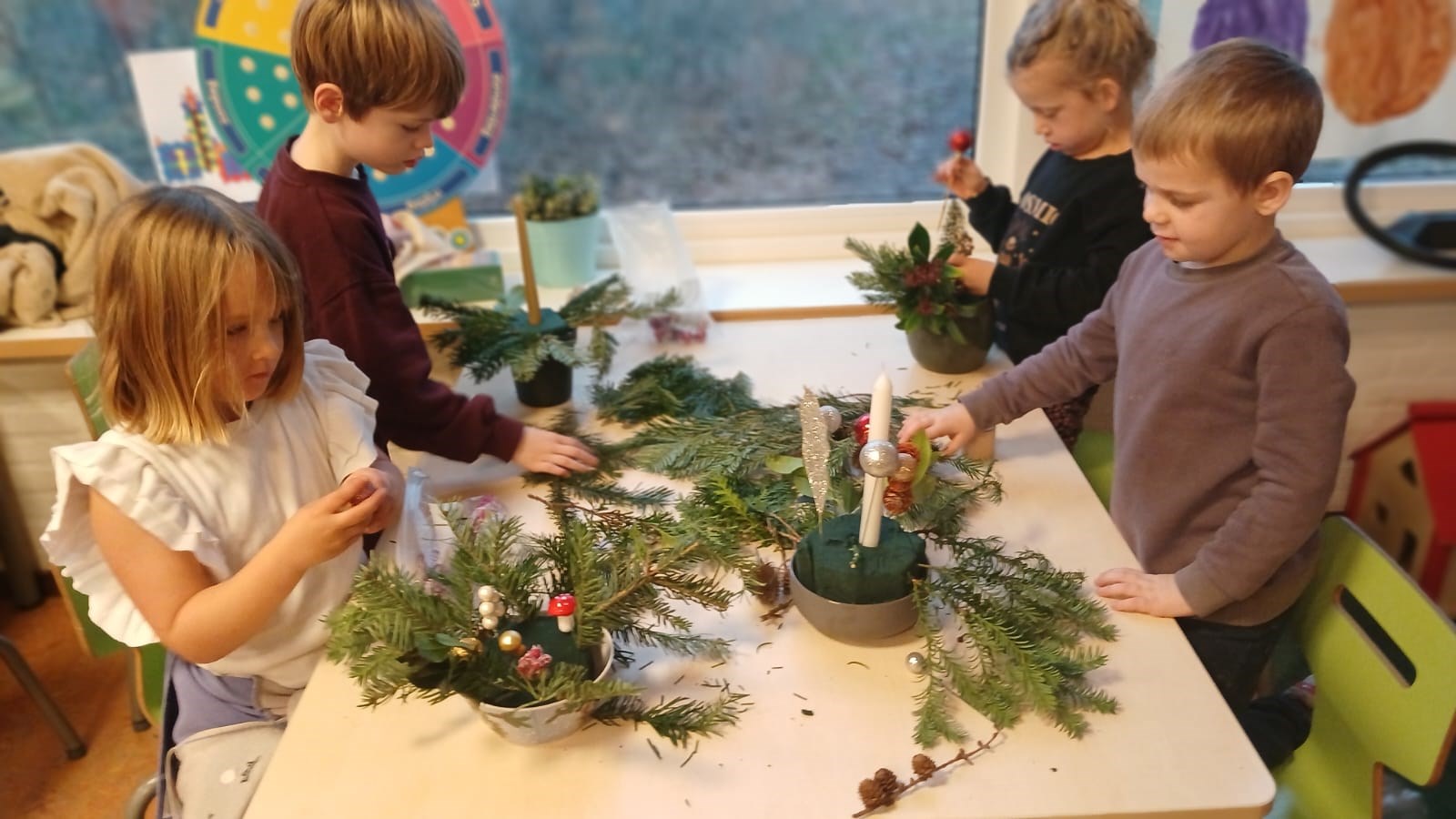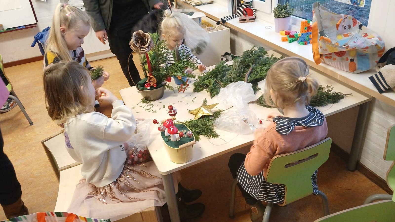 Daarnaast is er veel geknutseld: kerststukjes gemaakt, kerstballen en kerstbomen geverfd, kerstkaarten en kersthangers geknutseld. De klas kreeg hierdoor een echte kerstsfeer.