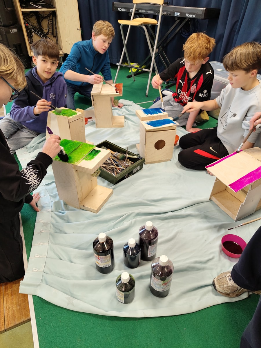 Een aantal leerlingen is al enige tijd bezig met het maken van vogelvoederhuisjes. Deze hebben we nu afgemaakt en met ecoline ingesmeerd. Het resultaat mag er zijn.