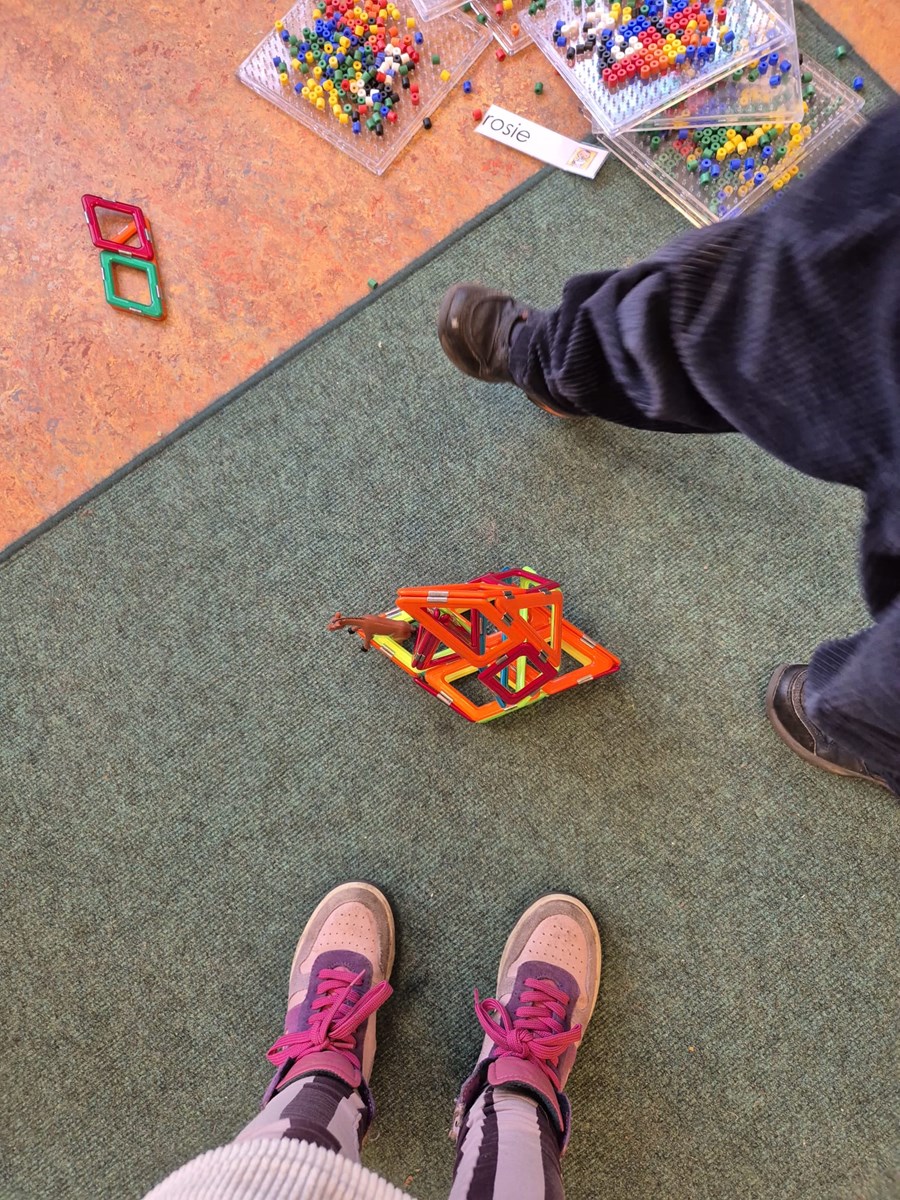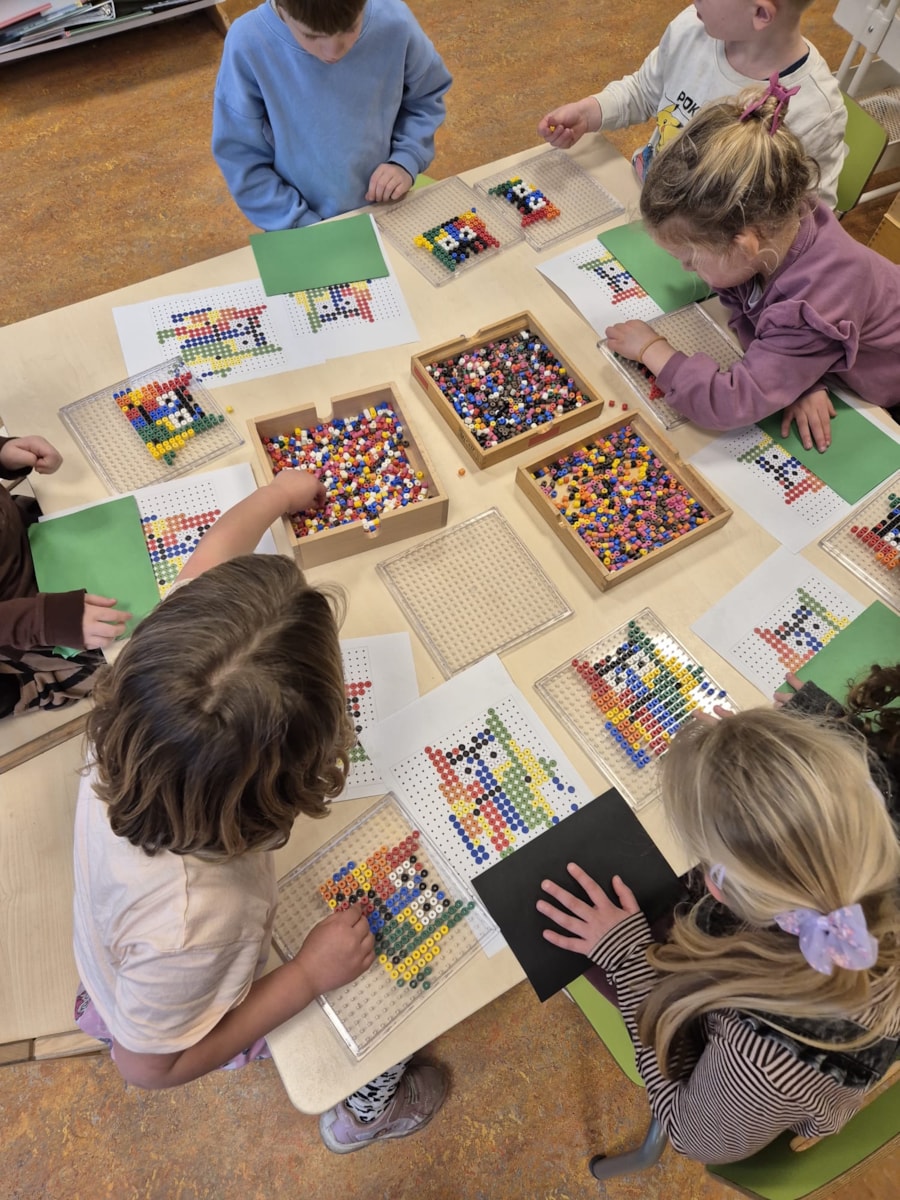 De oudste kleuters hebben een kralenplank gemaakt, aan de hand van het voorbeeld hebben de kinderen rij voor rij de kralen geteld en op de juiste plek neergelegd. Een uitdagend werkje maar met een fantastisch resultaat!
