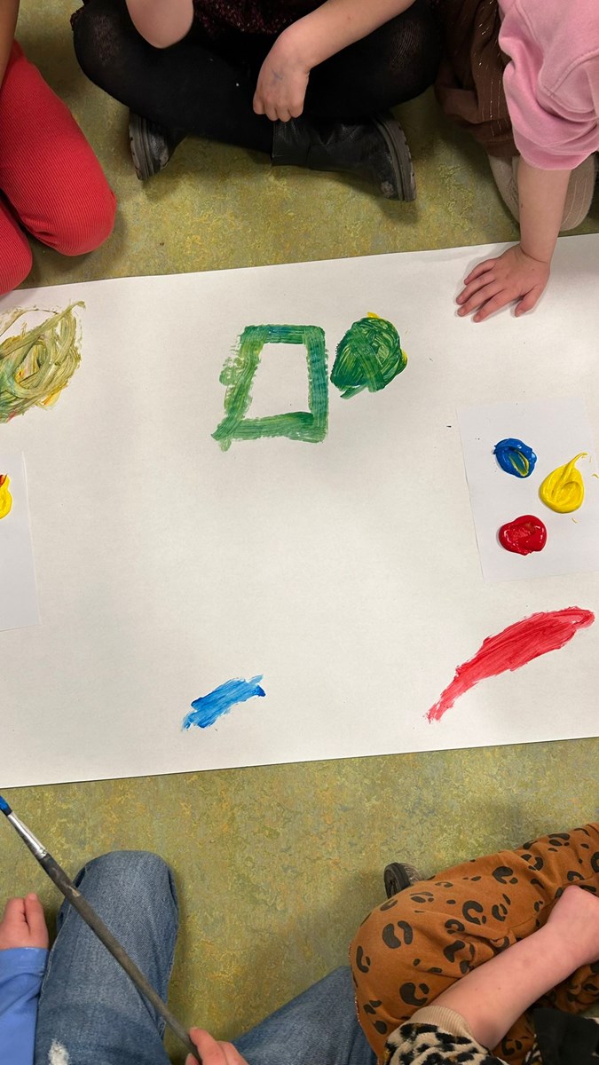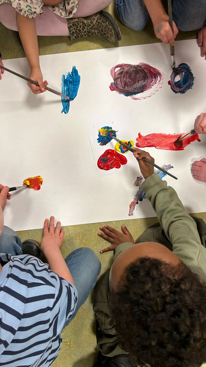 Maandagmiddag is het nieuwe thema geopend: Kunst! Als ware kunstenaars experimenteerden de kinderen op een groot vel papier met de primaire kleuren. Al snel werd er volop gemengd en kwamen zij erachter dat er een nieuwe kleur ontstaat wanneer je twee kleuren mengt.
