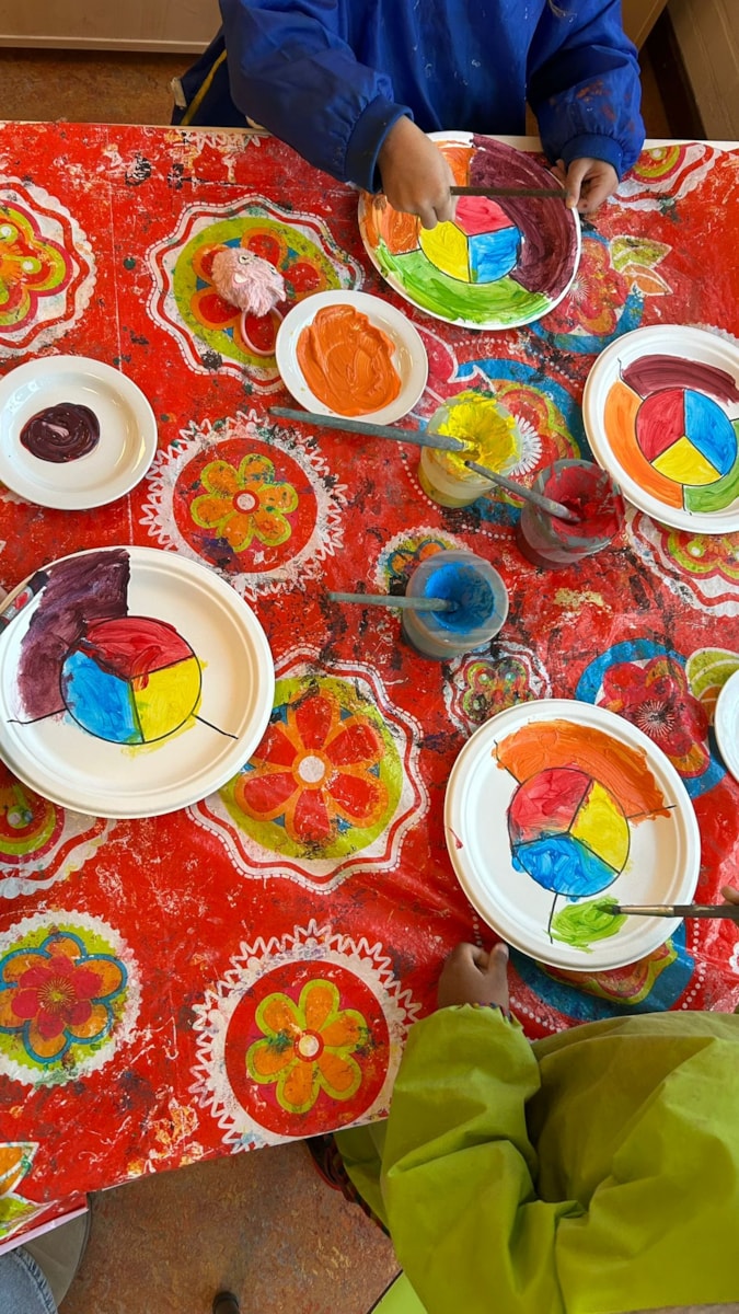 Woensdag maakten de kinderen een kleurenwiel met de primaire en secundaire kleuren. Deze hangen op het prikbord op de gang.