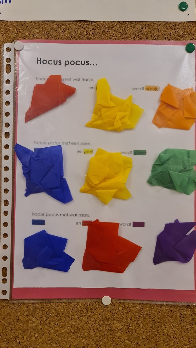 Dinsdag leerden de kinderen een nieuw versje dat over het mengen van kleuren gaat: Hocus, pocus … Ook maakten we een woordweb bij dit nieuwe thema.