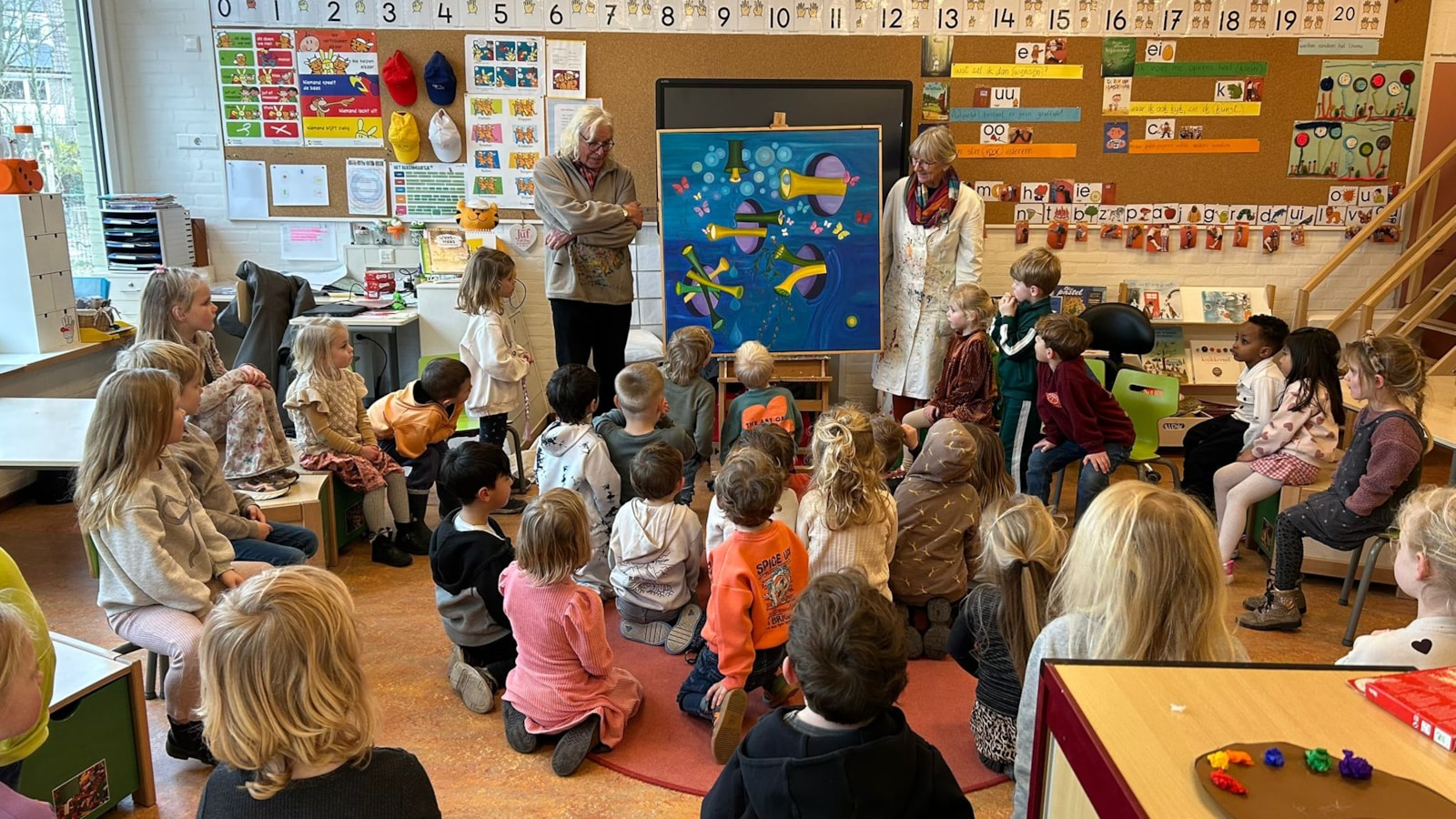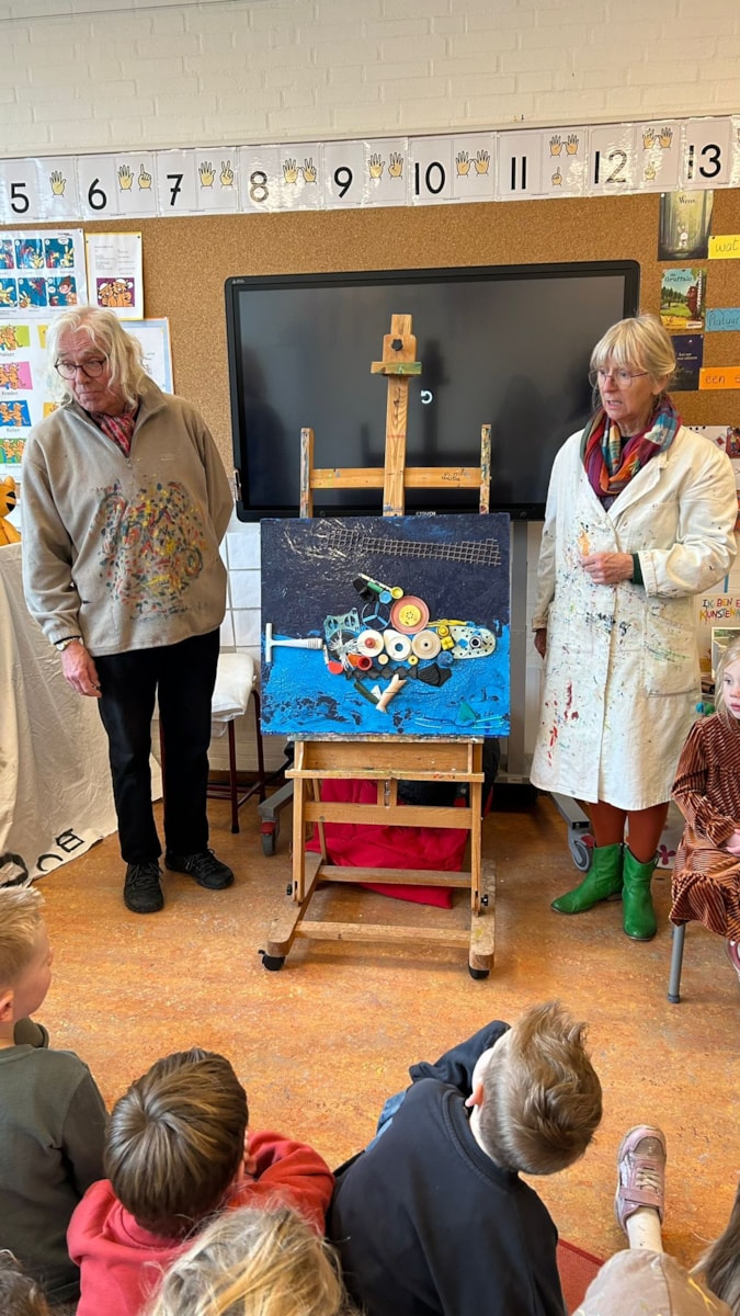 De opa en oma van Nina kwamen bij ons in de klas met een kunstwerk en een schilderij. Zij vertelden dat zij van zwerfafval kunst maken. De kinderen mochten het werk bewonderen en stelden hier verschillende vragen over. Ook werden er vragen over het kunstwerk en het schilderij aan de kinderen gesteld.