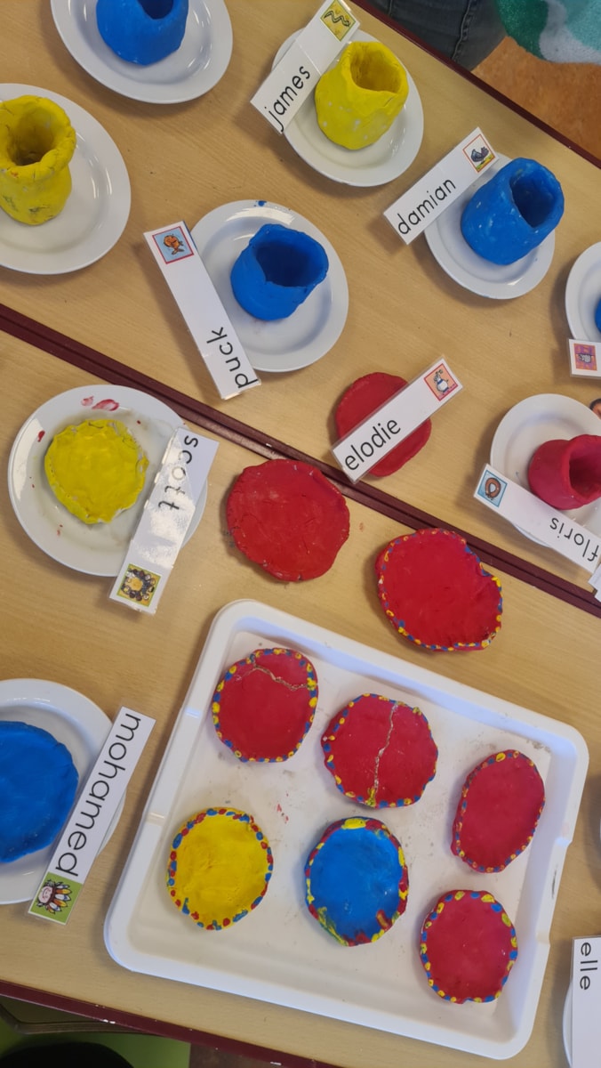Daarnaast hebben alle kinderen deze week gewerkt met chamotteklei. De oudste kleuters maakten een vaasje en de jongste kleuters een bordje. Aan het einde van de week zijn deze kunstwerken geschilderd. Hierbij hebben de kinderen extra geoefend met het maken van een patroon langs de rand.