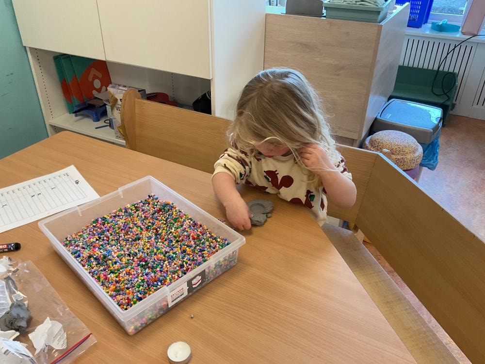 Als werkje hebben wij een waxinehouder gemaakt van klei. De kinderen mochten met klei en strijkkralen zelf een houder maken. Eerst moest de klei goed gekneed worden om zacht te maken. De spierballen kwamen hier goed van pas. Daarna werd er van de klei een bal gekneed om vervolgens het waxinelichtje in te drukken. Hierdoor ontstond er een duidelijke vorm. Als de vorm af was konden de kinderen de houder versieren met strijkkralen. Met de pincetgreep pakten de kinderen de kleine kraaltjes vast om ze vervolgens in de klei te drukken. Leuk om te zien hoe geconcentreerd de kinderen hier mee bezig zijn. De tongen vielen er spontaan van uit hun mond ;)