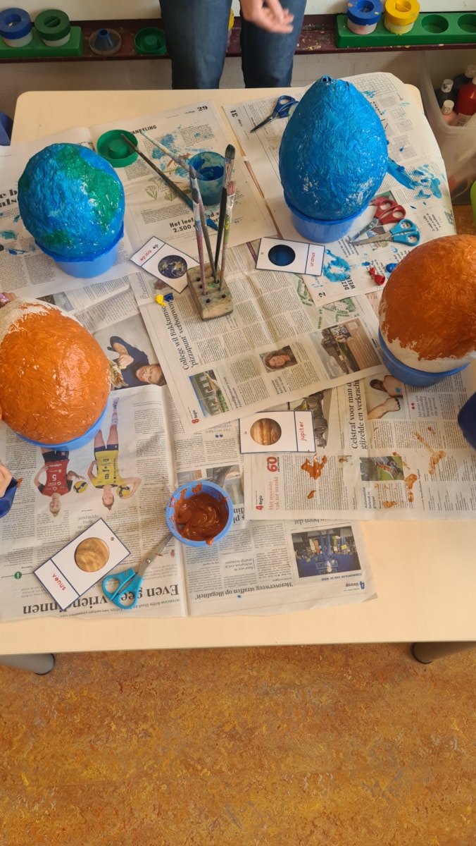 We zijn druk bezig geweest met het maken van onze eigen planeten van papier-maché. Tijdens een mooi gesprek kwamen de kinderen erachter dat de planeten in ons zonnestelsel niet allemaal even groot zijn. Dat inzicht hebben we meteen toegepast: samen hebben de kinderen besproken welke planeet het beste bij welke ballon past. Inmiddels hebben de eerste planeten al mooie en passende kleuren gekregen met verf.