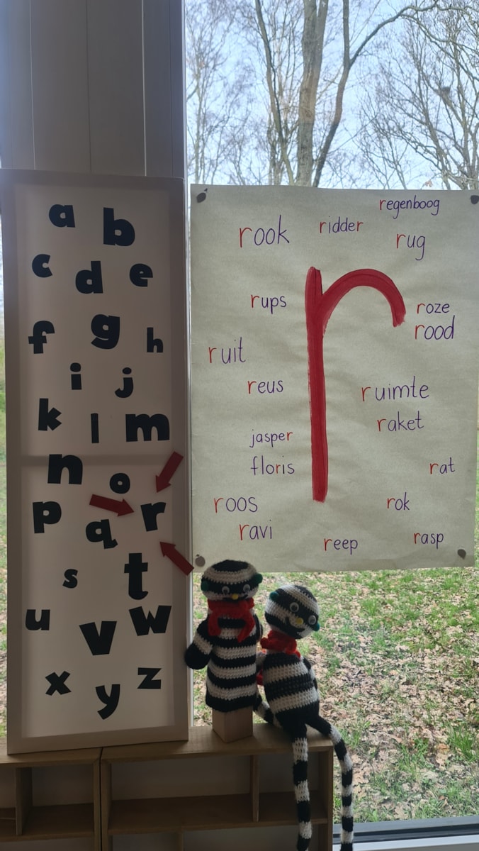 Tot slot stond deze week de letter /r/ centraal, van ‘ruimte’. De kinderen mogen spulletjes meenemen van thuis die beginnen met deze letter, om een plekje te geven in ons letterkastje.
