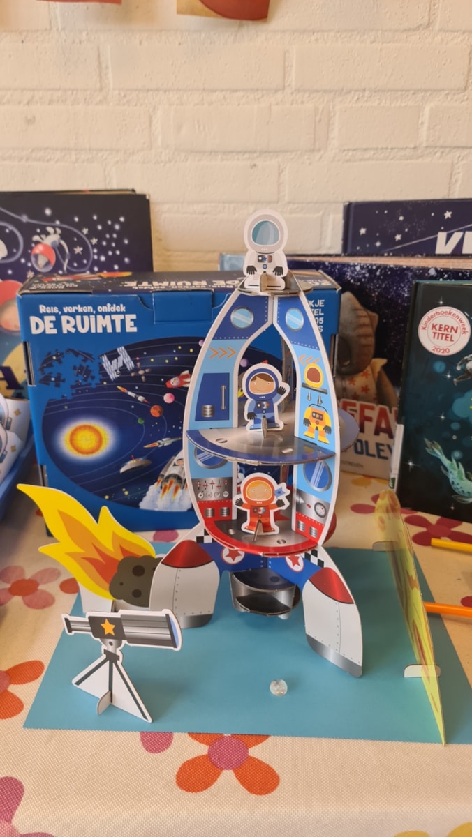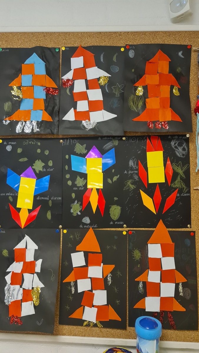 Deze week zijn er ook verschillende raketten geknutseld met mozaïekfiguurtjes en andere door gebruik te maken van het vouwen van de 16 vierkantjes. De kinderen zijn trots op hun resultaat!