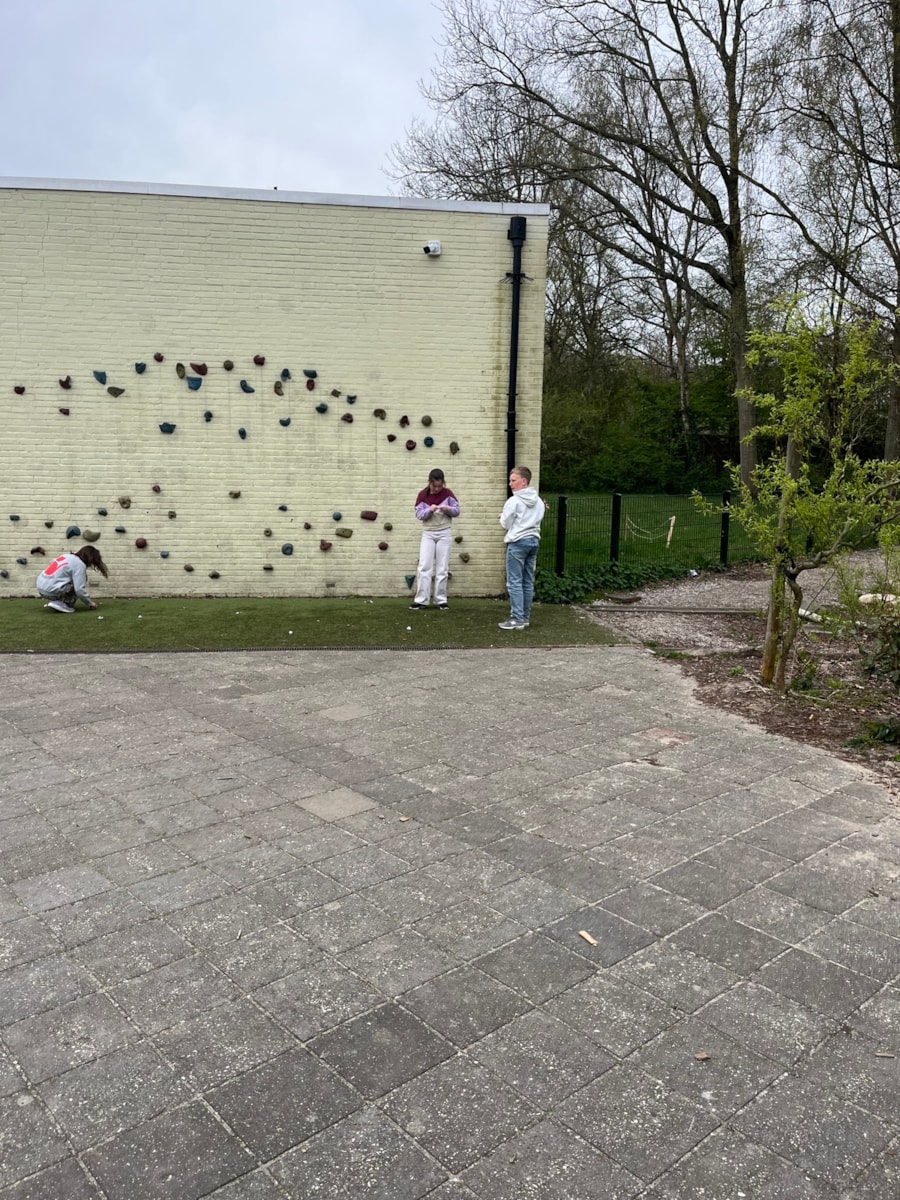 Het mooie weer nodigde deze week uit tot een aantal buitenlessen. Bij spelling deden we een propjesdictee. De kinderen renden naar een propje, lazen het woord, renden terug naar hun maatje en samen schreven ze het woord volgens de juiste spellingregels op. Zodra het eerste tweetal alle 20 woorden foutloos had ingeleverd, stopte het spel.