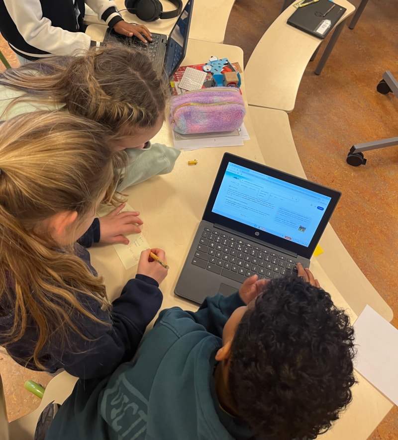 Naast juf Iris en juf Marlies staat ook juf Corine voor de klas. Zij zit…